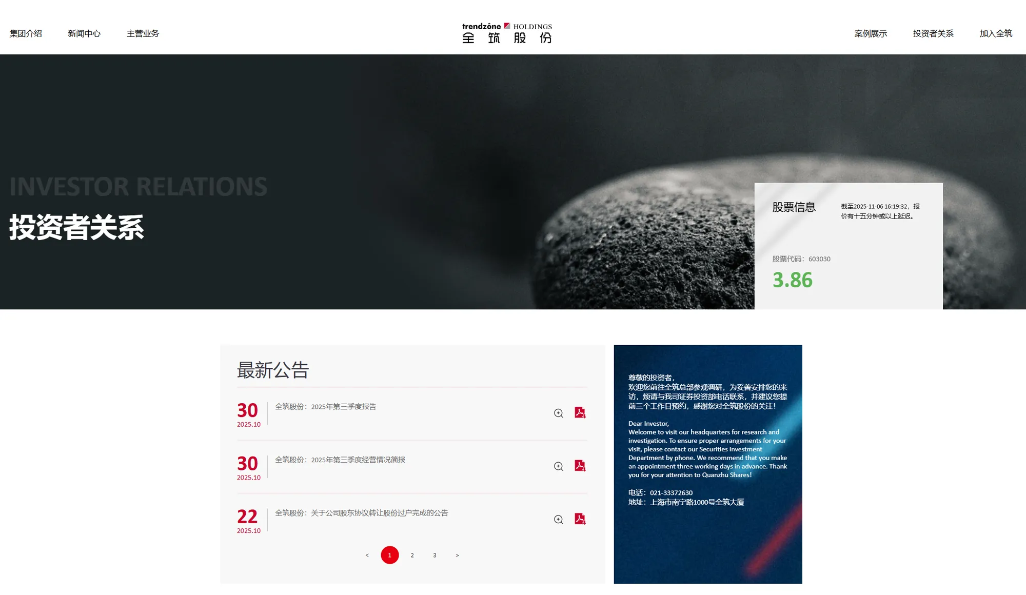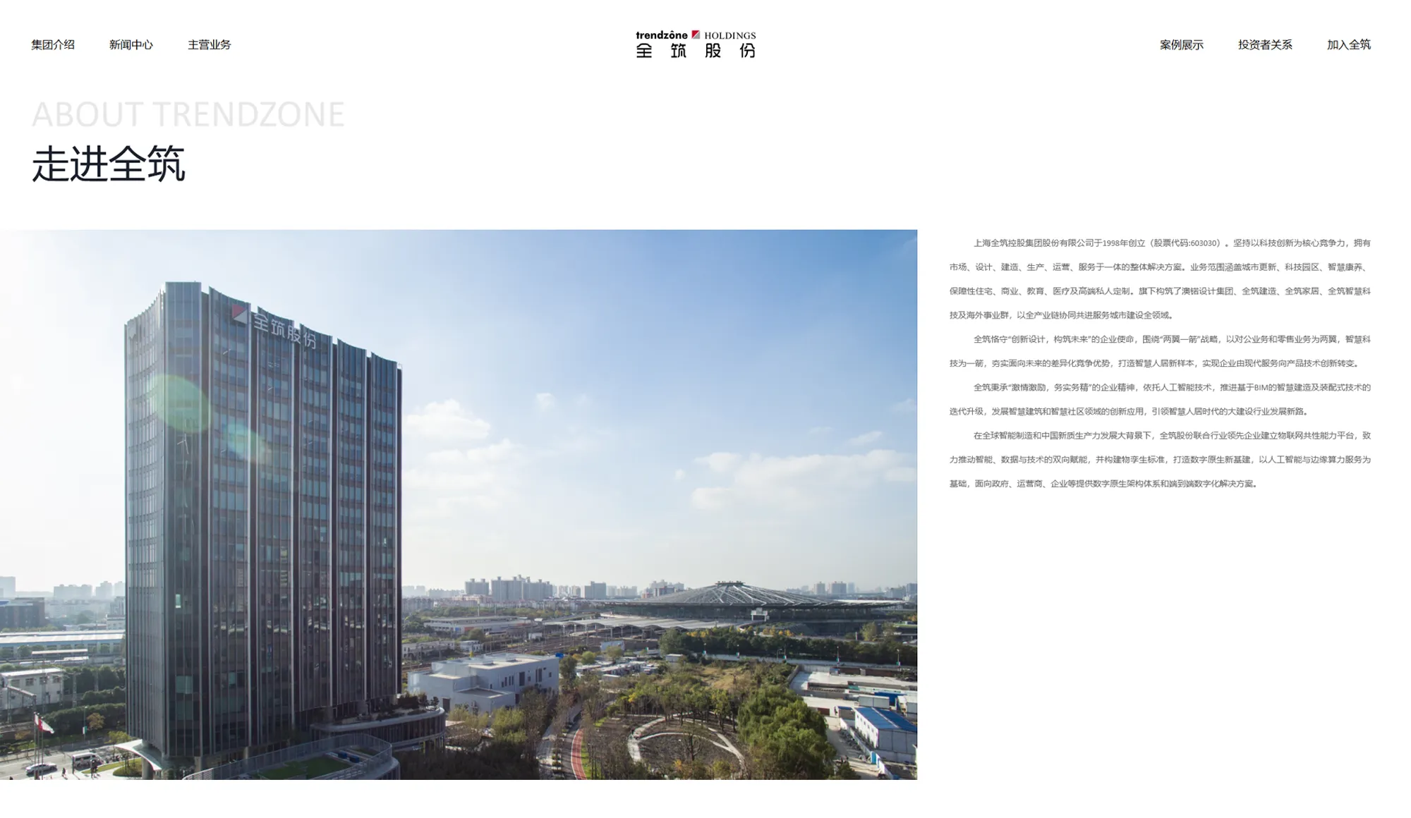 上海全筑控股集团股份有限公司于1998年创立(股票代码:603030)。坚持以科技创新为核心竞争力,拥有市场、设计、建造、生产、运营、服务于一体的整体解决方案。业务范围涵盖城市更新、科技园区、智慧康养、保障性住宅、商业、教育、医疗及高端私人定制。旗下构筑了澳锘设计集团、全筑建造、全筑家居、全筑智慧科技及海外事业群,以全产业链协同共进服务城市建设全领域。
