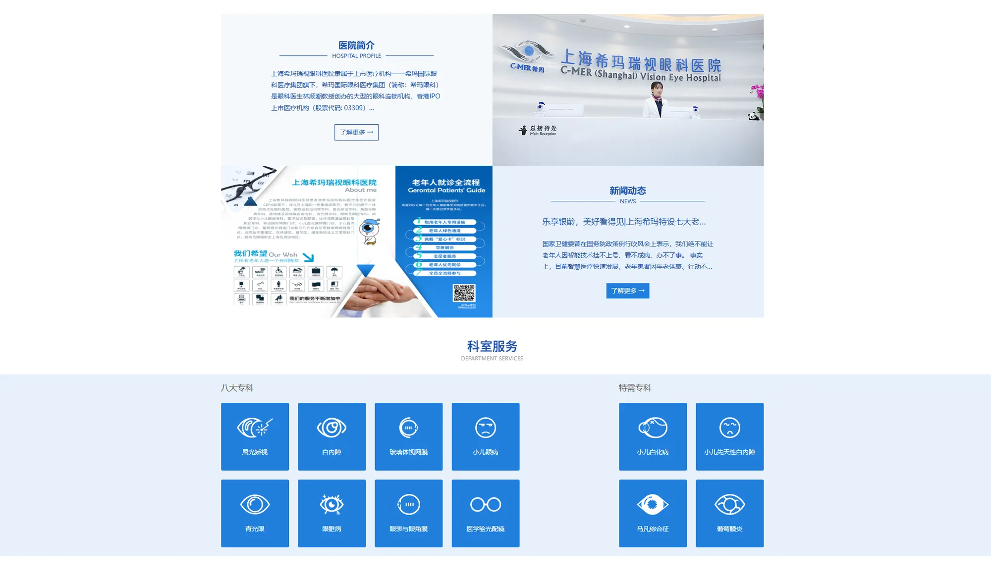 上海希玛瑞视眼科医院,是一所集临床医疗服务、教学与科研于一体的现代化眼科医院,医院设有屈光矫正、白内障、眼表与眼角膜、玻璃体视网膜、青光眼、眼眶病、小儿眼病、医学验光配镜8大专科,小儿白内障、小儿白化病、马凡氏综合症、葡萄膜炎4个国际特需门诊,服务范围涵盖眼科全领域,患者可享受从眼科基本检查到眼镜配镜、从特殊检查、专科诊室到各类眼科手术及术后的一站式眼科服务,避免了看病多处求诊的问题。
