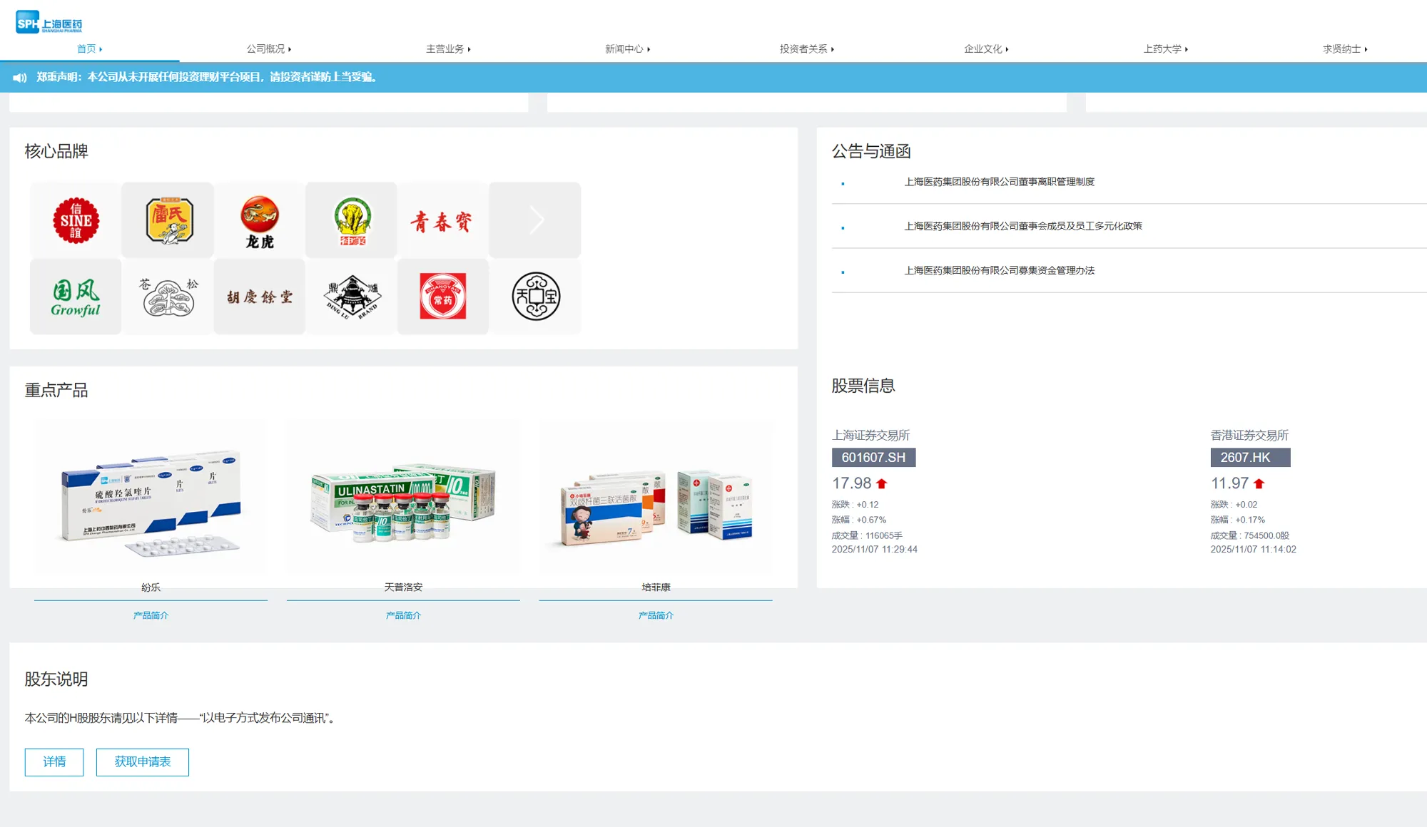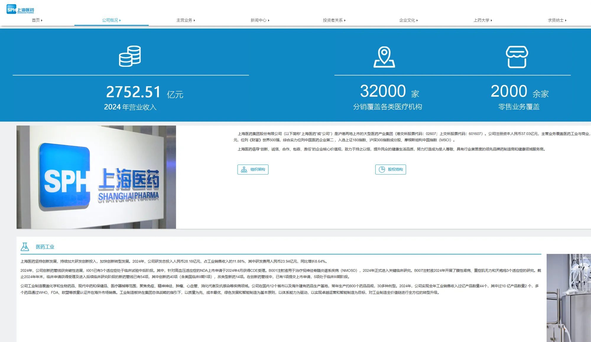 上海医药集团股份有限公司(以下简称“上海医药”或“公司”)是沪港两地上市的大型医药产业集团(港交所股票代码:02607;上交所股票代码:601607)。公司注册资本人民币37.03亿元,主营业务覆盖医药工业与商业,2024年营业收入人民币2752.51亿元,位列《财富》世界500强,综合实力位列中国医药企业第二 ,入选上证180指数、沪深300指数成分股、摩根斯坦利中国指数(MSCI)。 上海医药倡导“创新、诚信、合作、包容、责任”的企业核心价值观,致力于持之以恒,提升民众的健康生活品质,努力打造成为受人尊敬、具有行业美誉度的领先品牌药制造商和健康领域服务商。