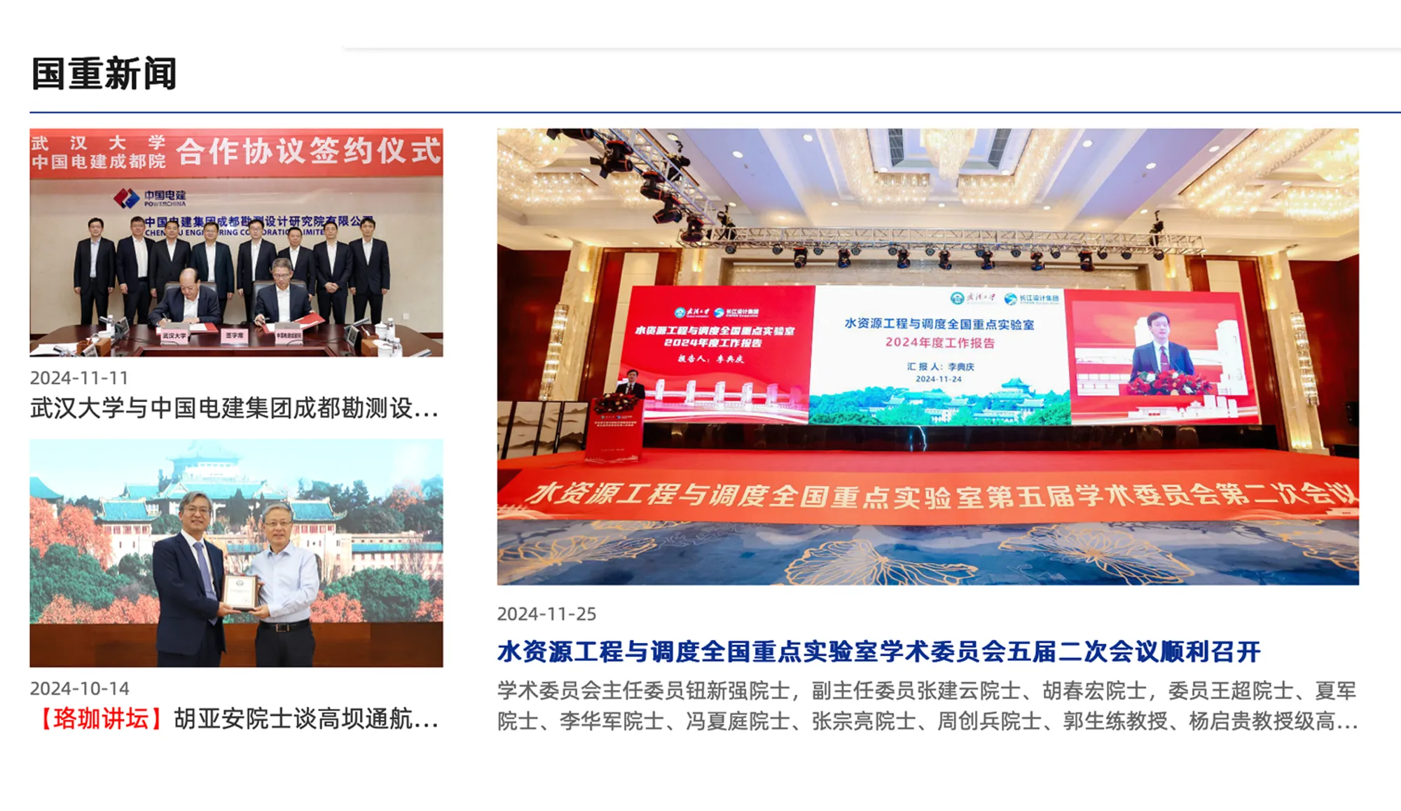 水资源工程与调度全国重点实验室” 在原有 “水资源与水电工程科学国家重点实验室” 基础上,依托武汉大学与长江设计集团有限公司组建,于2023年3月获批建设。实验室面向“长江经济带发展”“黄河流域生态保护和高质量发展”等国家重大战略需求和水资源领域国际学术前沿开展基础研究和应用基础研究,设置“水资源系统演变”“水资源配置工程”“水资源综合调度”三个重点研究方向。