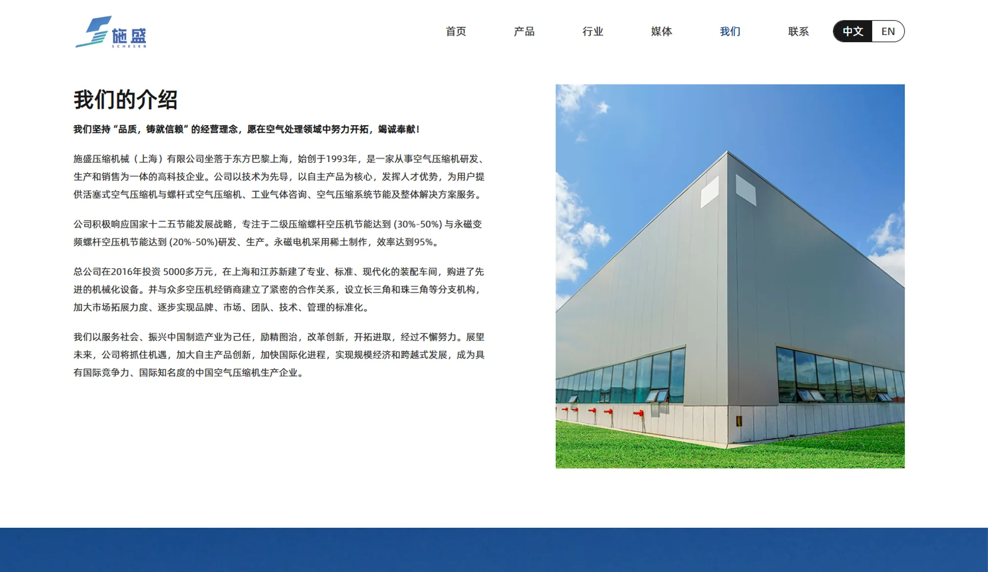 总公司在2016年投资 5000多万元,在上海和江苏新建了专业、标准、现代化的装配车间,购进了先进的机械化设备。并与众多空压机经销商建立了紧密的合作关系,设立长三角和珠三角等分支机构,加大市场拓展力度、逐步实现品牌、市场、团队、技术、管理的标准化。