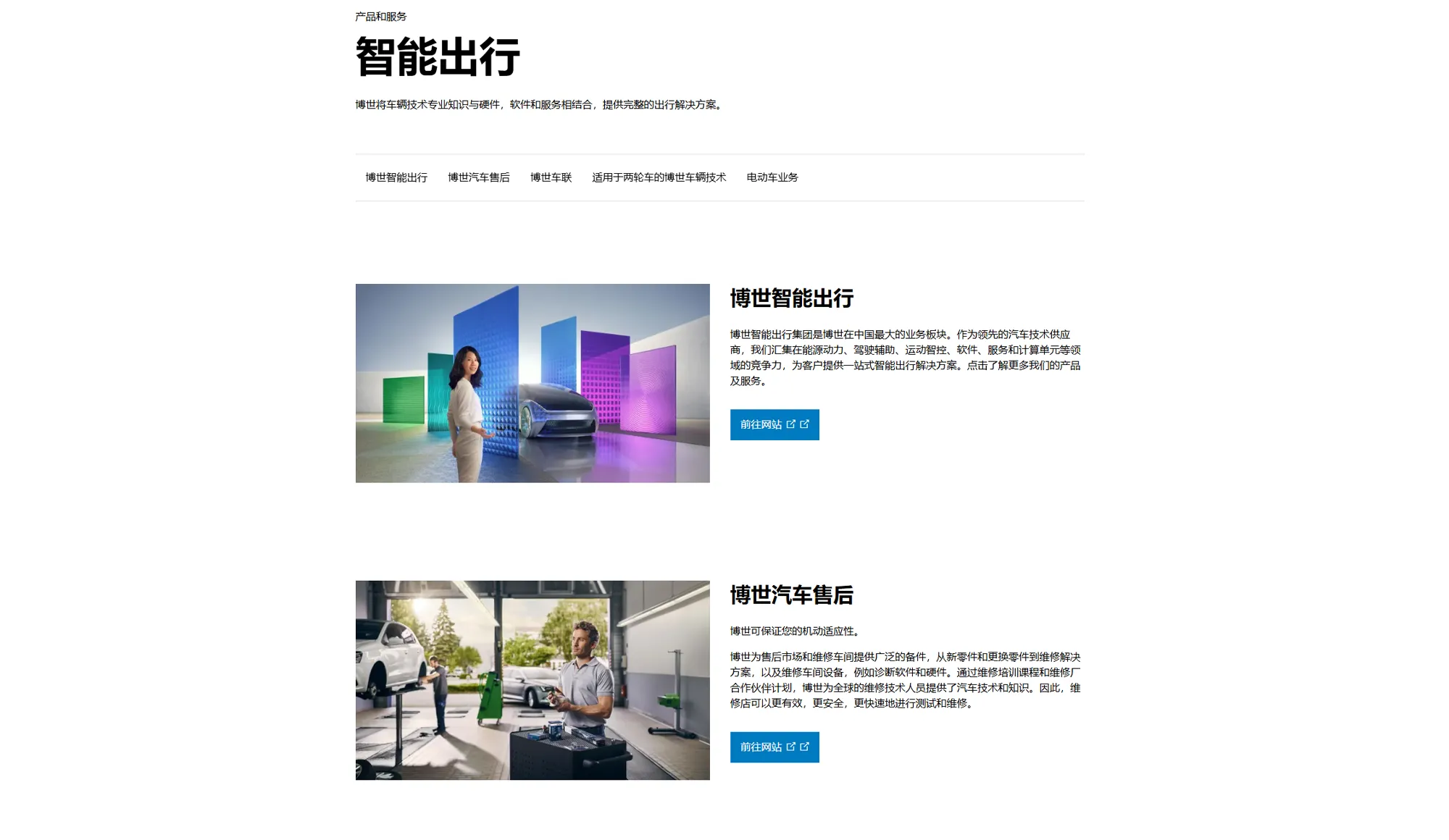 博世集团于1909年首次进入中国市场,开设了第一家贸易办事处。1926年,博世在上海创建了首家汽车售后服务车间。在过去的112年里,博世见证了中国社会日新月异的变化——尤其是改革开放以来经济的迅速崛起。博世集团秉承“根植本土、服务本土”的理念,深度融入了中国经济的发展,与中国市场共同成长。现在,博世为中国市场和用户提供汽车与智能交通、工业、消费品以及能源与建筑技术领域先进的技术和解决方案,在各个业务领域深刻地践行并诠释“科技成就生活之美”的理念。截至2020年12月31日,博世在中国经营着56家公司,销售额达1173亿人民币,中国市场首次成为博世集团最大的单一市场,也是博世除德国以外拥有员工人数最多的国家。